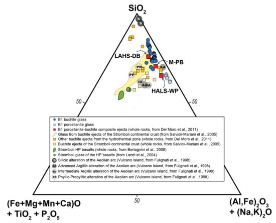 In the ternary diagram of Figure 9, the buchite suite from Del Moro et al. [21] is entirely distributed within a wide spectrum of hydrothermal alteration, namely intermediate-advanced argillic, phyllic-propylitic and silicic, taken as reference from Vulcano Island, in the same Aeolian Archipelago (and same subduction-related volcanism) to which Stromboli Island belongs [77]. Bulk rock and glass compositions of the B1 porcellanite–buchite xenolith follow a linear trend between the SiO2 and (Al, Fe)2O3 + (Na, K)2O components and show the same values of (Fe + Mg + Mn + Ca)O + TiO2 + P2O5. The chemical trends of the B1 xenoliths in Figure 9 could therefore be the result of the protolith signature (lavas or pyroclastics of Stromboli which suffered hydrothermal leaching) and the magmatic processes of the open system igneous pyrometamorphism leading to protolith transformation. By contrast, bulk–rock and glass compositions of the Stromboli buchites interpreted as deriving from deeper continental crust [17] show an increasing trend of (Fe + Mg + Mn + Ca)O + TiO2 + P2O5, decreasing SiO2 and relatively uniform (Al, Fe)2O3 + (Na, K)2O.