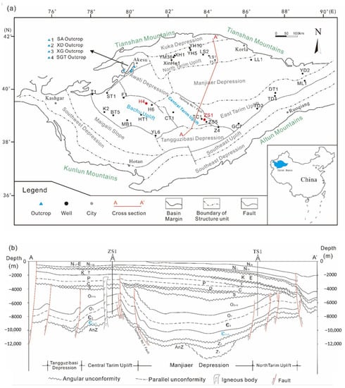 Schematic map showing the distribution of the structure units and drilling cores of the Tarim Basin (in stratigraphic symbols, AnZ stands for pre-Sinian, Z for Sinian, Є 1 + 2 for Lower–Middle Cambrian, and Є 3 for Upper Cambrian, and other symbols for the strata above Cambrian). (a)The distribution of the structure units, drilling cores, and outcrops [25,26]; (b) north-south stratigraphic section of the Tarim Basin [18,28].