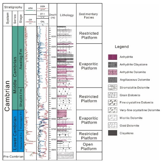 Stratigraphy and lithology of the Lower–Middle Cambrian deposits of well H4 in the Tarim Basin.