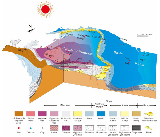 Seven sedimentary facies can be distinguished in the Lower–Middle Cambrian evaporite series of the Tarim Basin, which are ramp, platform margin, open platform, restricted platform, evaporitic platform, slope, and basin. Vertically, ramp deposits are mainly distributed in the Yuertus Fm. in the central and western Tarim Basin. In eastern Tarim, the ramp continued throughout the Cambrian period. It can be further subdivided into inner, middle, and outer ramp according to the lithology of sediments. Only very thin layers of claystones or claystones interbedded with limestones or dolomites with a thickness of no more than 10 m were found in the northwestern outcrops and the north Tarim uplift. The platform margin started to take shape during the sedimentary period of Xiaoerbrak Fm., which consists of microbial reefs and shoals. Platform margin deposits are developed from the Xiaoerbrak Fm. to the Awatag Fm. in the north Tarim uplift, east Tarim uplift, and northwestern outcrop area. The formation of the platform margin led to the evolution of the original ramp into a platform. At that time, no pronounced shoals and microbial reefs were developed at the platform margin that affected the water circulation between the platform and the ocean, so it was an open platform. An open platform also formed in the lower part of the Xiaoerbrak Fm. (Figure 2 and Figure 3), and the sediments form most of the Shayilik Fm. Due to the development of shoals and microbial reefs at the platform margin, the originally open platform gradually turned into a semi-closed restricted platform. Restricted platform deposits developed in the Xiaoerbrak Fm., usually represented by abundant intra-platform shoals. During the deposition of the Wusongger Formation, the platform margin gradually separated the platform from the ocean. Surrounded and restricted by the platform margin and the subaerially exposed area, a relatively closed sedimentary environment formed in the central platform area. Due to a dry and hot climate, the salinity increased continuously until gypsum and halite precipitated in some sort of very large inner platform salina. Together with dolomite flats, they eventually formed a large evaporitic platform (Figure 4). Evaporitic platforms are common in the Wusongger Fm. and the Awatag Fm., representing the precipitates from inner platform salina pans. Such salina areas have been discovered in the area near well H4. The deep-water basin was located in the Manjiaer Depression and Kuka Depression.