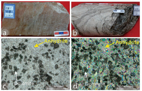 Most Early Middle Cambrian sediments of the evaporite series in the Tarim Basin are evaporites, carbonates, and claystones. The evaporites are mostly composed of halite (Figure 5a), anhydrite (Figure 5b), and mixed sediments with at least 50% anhydrite (Figure 5c,d). Among them, anhydrite is supposed to be formed by dehydration of gypsum precipitated from seawater, which occurs during a long period of burial diagenesis. The main mineral component of the anhydrite mixture is anhydrite, which is often associated with dolomite (Figure 5c,d) and clay. Evaporites are most widespread in the central Tarim uplift and the Bachu Uplift in the Wusonger Fm. and Awatag Fm. The carbonates include dolomites (Figure 6a–c) and limestones (Figure 6d). Dolomites are the most widely distributed Lower–Middle Cambrian rocks in the Tarim Basin. They occur in various formations in most areas of the basin and can be subdivided into stromatolitic dolomite, grain dolomites (or mimetically dolomitized grainstones), micritic dolomites, crystalline dolomites, and dolomites mixed with gypsum or claystone, in which the proportion of dolomite is more than 50%. Dolomitized ooidal and peloidal grainstones, as well as oncoidal rudstones, are mainly found in the Xiaoerbrak Formation. Micritic dolomites and crystalline dolomites are observed in almost every formation. Limestones are mainly developed in the Shayilik Fm. (Figure 6d), with a small thickness but a wide distribution, and exist in the central Tarim uplift, the Bachu Uplift, the northern Tarim Uplift, and in the outcrop area in the northwest of the Tarim Basin. The claystones (Figure 7) can be subdivided into normal claystones, anhydrite claystones (Figure 7a), and dolomitic claystones. Conceptually, the latter two are both claystones with a clay content of more than 50% and contain dolomite, anhydrite, and other associated minerals. The anhydrite claystones were found in the Wusonger Fm. and the Awatag Fm., whereas the dolomitic claystones were found in almost all the Lower–Middle Cambrian evaporite series.
