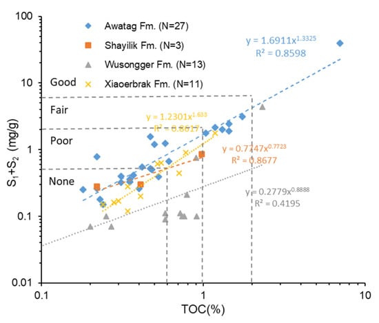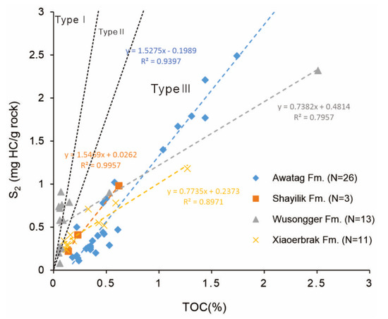 Plots of S2 versus TOC can also be used to study the organic matter type. As the data show, the S2 ranges from 0.05 to 66.04 mg HC/g rock and averages 1.73 mg HC/g rock. In detail, the S2 ranges from 0.11 to 66.04 mg HC/g rock and averages 3.14 mg HC/g rock in the Awatag Fm., from 0.14 to 0.62 mg HC/g rock and averages 0.33 mg HC/g rock in the Shayilik Fm., from 0.05 to 2.51 mg HC/g rock and averages 0.3 mg HC/g rock in the Wusongger Fm., and from 0.1 to 1.27 mg HC/g rock and averages 0.36 mg HC/g rock in the Xiaoerbrak Fm. (Table 1). The TOC and S2 are positively correlated in all of the four formations, and the fitting coefficients R2 were 0.8971, 0.7957, 0.9957, and 0.9397 from the Xiaoerbrak Fm. to the Awatag Fm. As the plot of S2 versus TOC shows, most of the organic matter is dominated by Type III kerogen but with minor Type I and Type II in the Wusongger Fm (Figure 10).