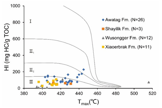 Fifty-four pyrolysis datapoints of well H4 show that the HI of shallow water source rocks ranges from 7 to 227 mg HC/g TOC and averages 78 mg HC/g TOC. Specifically, in the Awatag Fm., the HI ranges from 46 to 227 mg HC/g TOC and averages 110 mg HC/g TOC. In the Shayilik Fm., HI ranges from 56 to 64 mg HC/g TOC and averages 61 mg HC/g TOC. In the Wusongger Fm., the HI ranges from 7 to 108 mg HC/g TOC and averages 31 mg HC/g TOC. In the Xiaoerbrak Fm., the HI ranges from 29 to 108 mg HC/g TOC and averages 60 mg HC/g TOC. The Tmax ranges from 394 °C to 607 °C and averages 434 °C. In detail, the Tmax ranges from 403 °C to 445 °C and averages 424 °C in the Awatag Fm., from 412 °C to 431 °C and averages 423 °C in the Shayilik Fm, from 394 °C to 607 °C and averages 481 °C in the Wusongger Fm., and from 396 °C to 416 °C and averages 410 °C in the Xiaoerbrak Fm. (Table 1). The plot of HI versus Tmax can be used to classify the type of organic matter [40], and it shows that the kerogen in most samples of the Lower–Middle Cambrian evaporite series is predominantly Type III; only six samples were Type II (Figure 9).