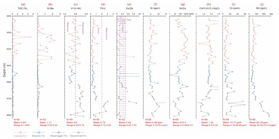 Geochemical data versus depth of the Lower–Middle Cambrian shallow water source rocks in the evaporite series, Tarim Basin: (a) TOC versus depth; (b) Sr/Ba ratio versus depth; (c) V/(V+Ni) ratio versus depth; (d) Th/U versus depth; (e) Cu/Zn versus depth; (f) nickel (Ni) versus depth; (g) Sr/Cu versus depth; (h) CaO (Al2O3 + MgO) versus depth; (i) chromium (Cr) versus depth; (j) manganese (Mn) versus depth. N = number of samples.