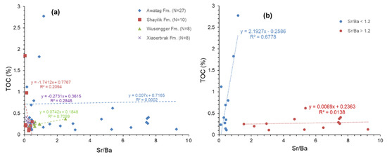 Correlation between Sr/Ba ratio and TOC content of the Lower–Middle Cambrian shallow water source rocks in the evaporite series, Tarim Basin. (a) Samples from all the four formations; (b) samples from the Awatag Fm. N = number of samples.