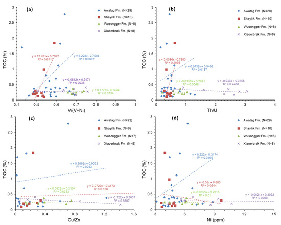 The Cr content is important index to evaluate the paleo-seawater depth since Cr is mainly adsorbed on clay minerals, and its content increases with the increase in seawater depth and distance from the coast [50]. Therefore, the content of Cr has a positive correlation with the paleo-seawater depth. As shown in Table 2 and Figure 11i, the Cr content decreases gradually from the Xiaoerbrak Fm. to the Awatag Fm., with average values of 28.45 ppm, 15.75 ppm, 12.47 ppm, and 9.62 ppm, respectively. This suggests that the platform area of the Tarim Basin became shallower throughout the Early and Middle Cambrian. Just like the Mn content, the correlations between Cr content and TOC are mainly positive but not that obvious because the fitting coefficient R2 values are all very small (Figure 15a).