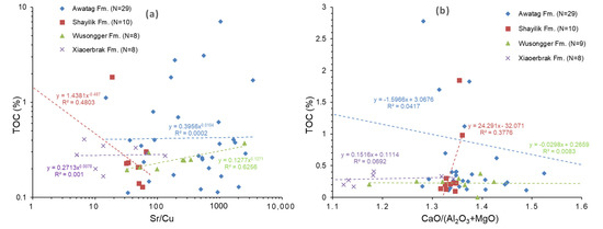 The Sr/Cu ratio is an index commonly used in paleoclimate studies [47]. The higher the Sr/Cu ratio, the dryer the paleoclimate. Ratios of Sr/Cu ranging between 1.3 and 5 represent a humid climate; ratios of Sr/Cu greater than 5 represent a dry and hot climate [47]. As shown in Table 2 and Figure 11g, all the Sr/Cu ratios of the samples from well ZS1 are greater than 5, suggesting that all the Lower–Middle Cambrian shallow water source rocks were developed in a dry and hot environment. In detail, the Sr/Cu ratios have the highest values in the Awatag Fm., with an average of 746. The second highest values are in the Wusongger Fm., with an average of 451, and the lowest values are in the Shayilik Fm. and the Xiaoerbrak Fm., with average values of 43 and 36. Comparatively, the paleoclimate of the Awatag Fm. and the Wusongger Fm. during sedimentation was much dryer and hotter than that of the Shayilik Fm. and the Xiaoerbrak Fm. Further analysis of the correlation between the TOC and the Sr/Cu ratios indicates that the correlation is only negative in the Shayilik Fm., but weakly positive in the other formations (Figure 14a).