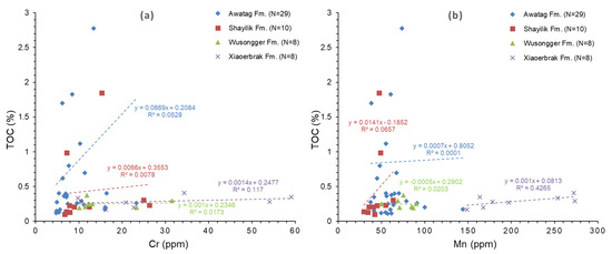Previous studies [44,50,51] have shown that Mn can stably exist in ionic solutions, so in the seawater environment, Mn is more likely to be enriched in the still water seafloor far from the coast. Therefore, the content of Mn in marine mudstone, shale, and micritic limestone is used as an index to analyze the distance from the coast or the depth of paleo-sea water. The greater the Mn content, the greater the depth of the paleo-seawater [44]. As shown in Table 2 and Figure 11j, the Mn content is the highest in the Xiaoerbrak Fm., with an average value of 206.84 ppm, while the contents in the Wusongger Fm., the Shayilik Fm., and the Awatag Fm. have average values of 72.06 ppm, 44.21 ppm, and 63.87 ppm, respectively. TOC and Mn content have a weakly positive correlation in all of the four formations but with very small fitting coefficient R2 values (Figure 15b). As shown in Figure 15a,b, although the correlation between the TOC values and the contents of Mn and Cr in each formation is not ideal, it can be seen that the samples with TOC values greater than 0.5% have lower contents of Mn and Cr, while the samples with higher contents of Mn and Cr have TOC values lower than 0.5%. This shows that the enrichment of organic matter in shallow water source rocks only occurs in a certain paleo-seawater depth.
