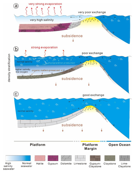 According to these results, the platform source rocks probably formed in a period characterized by high-frequency sea-level fluctuations. They are common in the lower parts of the Wusongger Formation and Awatag Formation. Taking well H4 as an example (Figure 2), the upper part of the Wusongger Formation was deposited during a stable period of very high salinity, and the thick continuous halite inhibited the formation of platform source rocks such as anhydrite claystone and dolomitic claystone. In contrast, during the deposition of the Shayilik Formation, a large amount of limestone formed, indicating more or less normal marine conditions on the platform. Due to the well-oxygenated water, most of the produced organic matter was decomposed on the seafloor, and thus the TOC content of the sediments did not increase. During the deposition of the lower part of Wusongger and Awatag Formations, however, rapidly changing lithologies of halite, gypsum, and claystone, including dolomitic claystone and gypsum claystone, indicate minor but high-frequency sea-level fluctuations. Probably, during short-term rises, low-TOC limestones formed in well-oxygenated, more or less normal marine water (Figure 16a). Later, with ongoing restriction of the platform and reduced water exchange, a salinity-stratified water body developed on the platform with well-oxygenated surface water but less oxygenated or even anoxic bottom water. Organic matter produced in the surface water was only incompletely decomposed in the strongly stratified water body, resulting in the formation of TOC-rich but carbonate-poor shallow platform source rocks lacking evidence of benthic life (Figure 16b). The overall salinity of the platform water during these times was probably elevated but not high enough for evaporation. The uppermost part of the water bodies contained sufficient free oxygen and evaporation led to relatively high salinity, which was suitable for the survival of aerobic halophil algae and zooplankton. Deposits from such settings are often characterized by high TOC contents resulting from abundant halophilic algae microorganisms and thus can form hydrocarbon source rocks [5,11,12]. The late stages of these cycles are characterized by very shallow conditions and very high salinity, resulting in the formation of evaporites (Figure 16c). These evaporites have very low TOC content because the salinity was too high for planktic production. During the late stage of the Awatag Formation, evaporative conditions persisted for a long time, and the deposition of thick monotonous halites suppressed the formation of shallow platform source rocks.