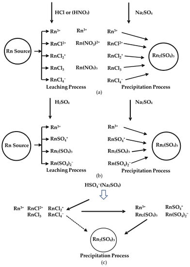 Schematics showing leaching process and precipitation process of (a) HCl or HNO3 system; (b) H2SO4 system; and (c) conversion of Rn-Cl complexes to the Rn-SO4 complexes and their precipitation.