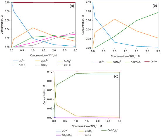 The three acids, HCl, HNO3, and H2SO4, are commonly used to extract REEs from various sources. When REEs are extracted into solution, there are many forms of REE complexes that are produced during the leaching process [,,]. Examples of Ce speciation in different acid systems are shown in Figure 2. As shown in Figure 2, in HCl, Rn3+, RnCl2+, RnCl2+, RnCl3, and RnCl4− (Figure 2a) were formed in the solution depending on the concentration of Cl− in the solution. It can be noted that the concentration of the free rare earth element, Rn3+, decreases rapidly with an increase in the Cl− concentration. For the nitrate system, as shown in Figure 2b, Rn3+, RnNO32+, and Rn(NO3)3 are present in the system, whereas in the H2SO4 system, as shown in Figure 2c, RnSO4+, Rn(SO4)2−, and Rn2(SO4)3 are present in the system.