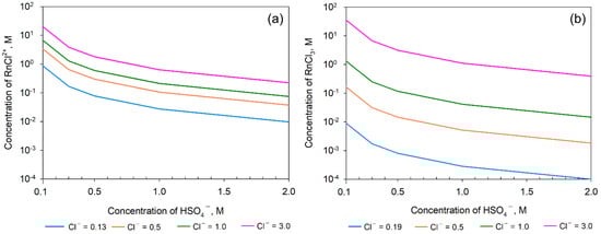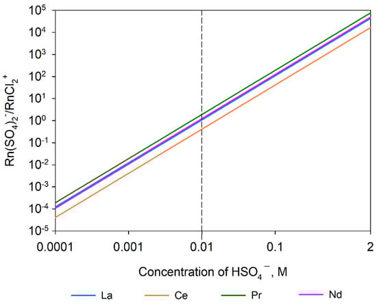 An alternate model is shown in Figure 1c, in which complexed REE species with either Cl− or NO3− are re-complexed with sulfate, as Na2SO4 is added to precipitate to a desired sulfate. This is possible because chloride or nitrate complexes are easily converted into sulfate complexes under high concentrations of sulfate in the system. Figure 3 shows the ratio of Rn(SO4)2− to RnCl2+ as the concentration of HSO4− increased from 10−4 to 2 mol/L. As seen in this figure, the chloride form of the Rn complex is predominant at low sulfate concentrations, while the ratio increases significantly with increasing sulfate concentration. As the concentration of sulfate exceeds 0.01, which is in the range of practical applications, the dominant species becomes the Rn–sulfate complex.