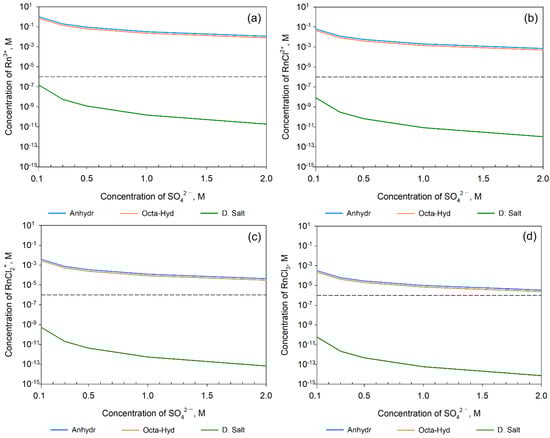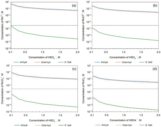 Graphical presentation of precipitation of Rn3+, RnCl2+, RnCl2+, and RnCl3 into three sulfates, anhydrous, octa-hydrated, and sodium double salt at pH 3 with HCl (dashed line: 1 ppm). (a) Rn3+ precipitates into the three products. (b) RnCl2+ precipitates into the three products. (c) RnCl2+ precipitates into the three products. (d) RnCl3 precipitates into the three products.