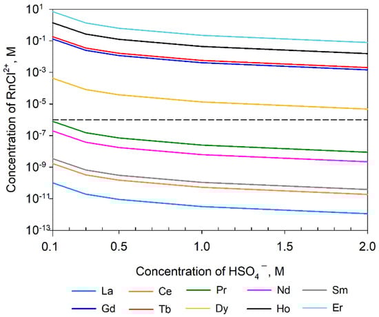 In the species diagrams shown in Figure 2, the most abundant species of REEs is RnCl2+ in the Cl− system and RnNO32+ in the NO3− system, while Rn(SO4)2− is the predominant sulfate species over a wide range of SO42− concentrations.