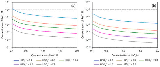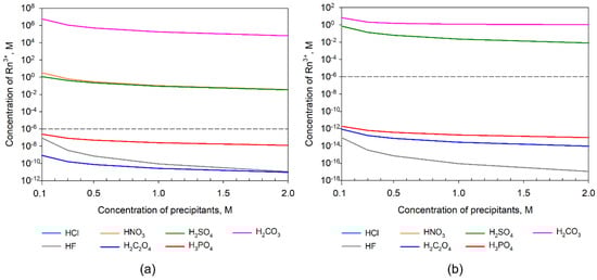 Equilibrium concentrations of Rn3+ for precipitation into Rn2(SO4)3 at (a) pH 1; and (b) pH 3, and the results are compared with those of carbonate, fluoride, oxalate, and phosphate (dashed line: 1 ppm line).