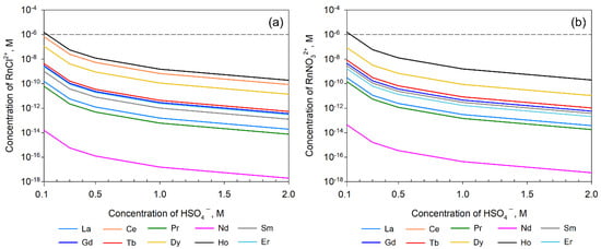 Another important aspect to be considered in the calculation of the equilibrium concentration of REE-bearing species is that when Na2SO4 is added to increase the concentration of the precipitant, HSO4− or SO42−, there are two moles of Na+ present for each mole of HSO4− or SO42−, which should be reflected in the calculation, as in the case of Equation (6).