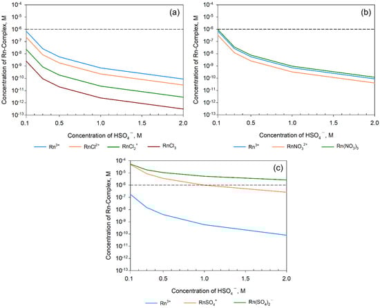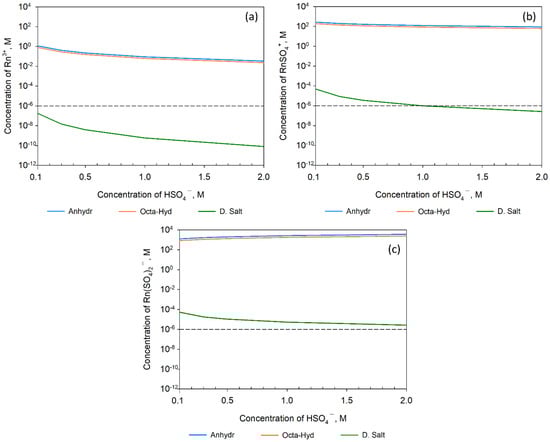 Graphical presentation of precipitation of Rn3+, Rn(SO4)+, and Rn(SO4)2− into three sulfates, anhydrous, octa-hydrated, and sodium double salt at pH 1 with H2SO4. (a) Rn3+ precipitates into the three products. (b) Rn(SO4)+ precipitates into the three products. (c) Rn(SO4)2− precipitates into the three products.