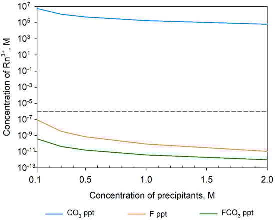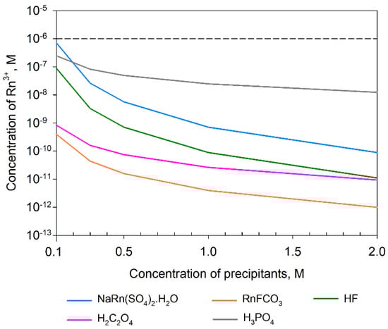 Equilibrium concentrations of Rn3+ for precipitation into NaRn(SO4)2·H2O at pH 1, and the results are compared with those of fluoride, fluoro-carbonate, oxalate, and phosphate (dashed line: 1 ppm line).