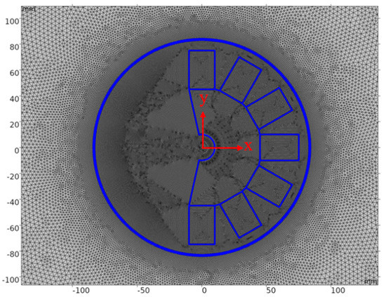 The physical field control or users’ control can be selected for the mesh generation, in order to get more suitable mesh size and distribution, the latter is selected in this study. The overall mesh type is free triangle mesh, and the size is predefined/extremely refined, then the outer area of the drum is calibrated to hydrodynamics. The customized cell size is selected in the inner area of the drum and the magnetic system area, and the maximum cell size is limited to 1 mm to form a finer mesh. Figure 2 shows the 2D structure of the main body of ADMS and the results of mesh generation.
