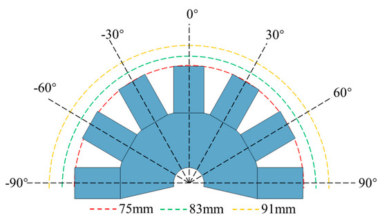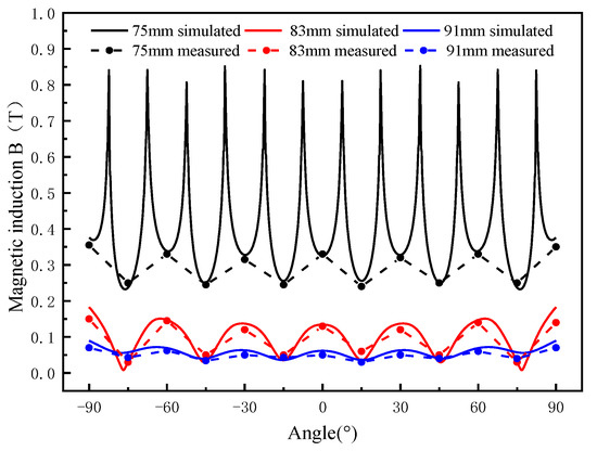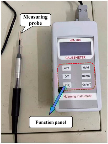 In order to verify the accuracy of the magnetic field simulation results, it is necessary to measure the magnetic induction of each point around the magnetic system, and then compare with the simulation results. There are many ways to measure the magnetic field [37,38,39], among which the use of Tesla meter is relatively simple and accurate. In this study, HM-100 Tesla meter was used, as shown in Figure 3. The measuring position is shown in Figure 4, and the points are evenly taken at 75 mm (at the surface of the magnetic pole), 83 mm (at the surface of the drum), and 91 mm from the center of the magnetic system, with an interval of 30°. Take the average value after each measurement three times [40,41].