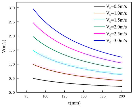 It can be seen that the airflow velocity decays the fastest near the surface of the drum (Figure 8), and the greater the initial velocity is, the greater the pressure gradient it generates (Figure 9); at the same time, the pressure gradient decays rapidly as the distance x increases (Figure 9).