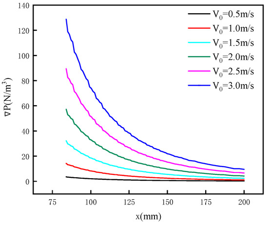 The pressure gradient change of the air flow along the x direction with different initial velocity.