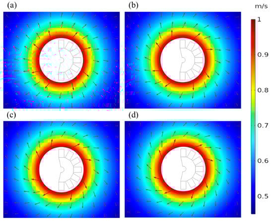 In order to explore the influence of the drum rotation velocity on the surrounding airflow distribution, the flow field vectors when = 1.0 m/s and the drum rotation velocity is, respectively, 3, 6, 9, 12 rad/s, and the results are shown in Figure 10. It can be seen that the rotation velocity of the drum has a certain influence on the direction of the airflow. When the rotating velocity of the drum exists, the direction flow filed is not along the normal direction of the drum, but a corresponding deviation is generated in the tangential direction, that is, the direction of the sum of the drum linear velocity vector and the air velocity vector. Obviously, the greater the rotation velocity of the drum, the greater the deflection amplitude of the airflow direction, which is not conducive to the separation of non-magnetic particles toward the radial direction of the drum.