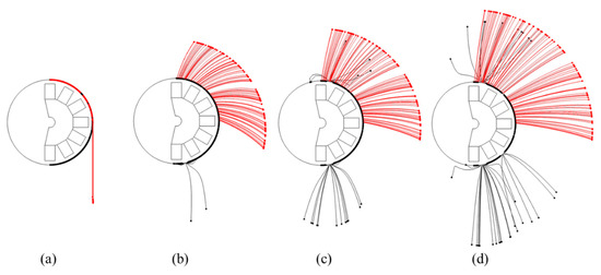 Figure 11 shows the trajectory of particles with a diameter of 45 μm after being randomly released on the surface of the drum ( = 1.2 T, = 3 rad/s) when the initial air velocity is different. Black represents magnetic particles, and red represents non-magnetic particles. The dynamic process of particle motion can be obtained by viewing the Video S1.
