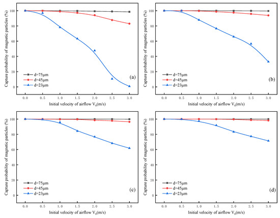 Variation of magnetic particle capture probability with air velocity under different remanence conditions: (a) = 1.0 T, (b) = 1.2 T, (c) = 1.4 T, and (d) = 16 T.