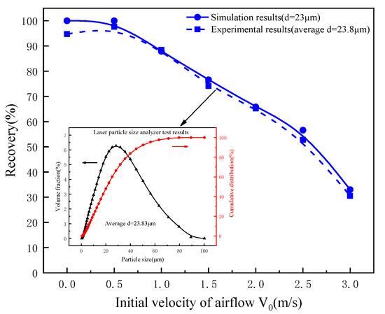 In order to verify the accuracy of particle tracking simulation results under a multi-physical field, magnetic separation experiments were carried out after grinding pure magnetite to a certain particle size. The recovery rate of magnetic particles at different initial velocity of air flow was calculated and compared with the capture probability of magnetic particles calculated by simulation under the same conditions.