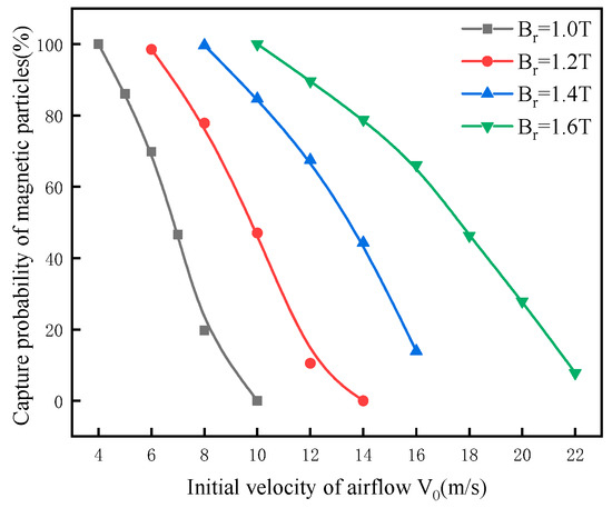 Generally speaking, the remanence intensity of the magnetic source material directly determines the magnetic field intensity in the separation zone. As shown in Figure 12a, when = 1.0 T and = 3.0 m/s, the capture probability of magnetic particles with diameter of 23 m almost decreases to 0; with the increase of , the capture probability of magnetic particles at higher flow velocity increases significantly. Table 2 shows the critical flow velocity when the capture probability of fine magnetic particles (d = 23 m) is 80% under different remanence conditions. When = 1.0 T, the flow velocity must be less than 0.95 m/s to ensure that more than 80% of magnetic particles can be recovered. When = 1.6 T, the critical flow velocity increases to 2.77 m/s. As can be seen from Figure 11 above, the higher the airflow velocity is, the more favorable the separation of non-magnetic particles is. Therefore, the use of magnetic source materials with large remanence can ensure the recovery of magnetic particles and increase the airflow velocity to a critical level, which can separate magnetic particles and non-magnetic particles to the greatest extent.