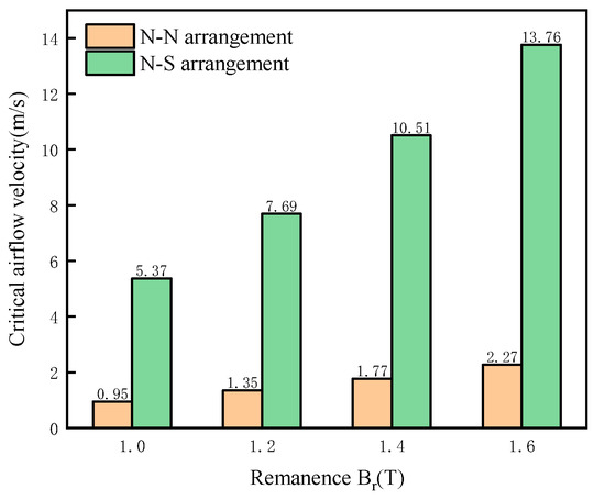 Comparison of critical airflow velocity when the capture probability of magnetic particles (d = 23 m) is 80% under different arrangement of magnetic system.