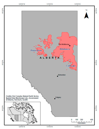 Canada’s vast oil sand resources are located almost exclusively in northeastern Alberta, within three core areas, namely the Peace River, Athabasca and Cold Lake deposit regions (Figure 1) [7,20]. Collectively, these accumulations span an area of approximately 142,000 km2 [7,21], the largest of which is the Athabasca region, containing ~75% of the provincial reserves [20,22].