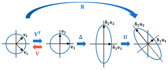 It is useful to explain the SVD from a geometric perspective as a series of orthogonal axis rotations and scaling of unit matrices about the origin. As shown in the simplified interpretation for a matrix (Figure 2; after [46,47]), the SVD can be summarized as a linear transformation composed of three fundamental actions. These actions include: (1) rotation of the right singular vectors of matrix within the original unit sphere; (2) scaling by the singular values of matrix , which correspond to the length of the principal semiaxes of the new hyperellipse; (3) rotation of the left singular vectors of matrix , oriented along the same principal semiaxes [47,48].