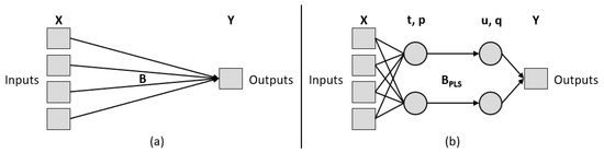 Simplified schematic comparison of multiple linear regression (MLR) and partial least squares (PLS) regression methods. (a) MLR uses all original variables to directly form a linear combination via the normal equations; (b) PLS first transforms the original variables by projecting to latent structures (linear combinations) that maximize covariance (orthogonality) between the new variables ( and ) (modified after [50].