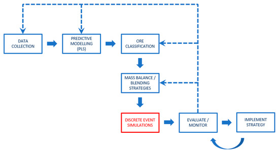The current study is an adaptation of recent DES modelling work by Navarra et al. [15,55] and Wilson et al. [17], which focused on the implementation of alternate modes of operation to balance plant ore feed types with respect to system-wide dynamics. By integrating predictive PLS regression modelling into a DES framework, this work demonstrates the potential benefits of using ore characterization data collected at an early stage to evaluate the future performance of system processes under geological uncertainty.