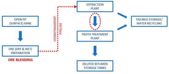 Generalized flowsheet for the extraction of diluted bitumen (“dilbit”) from mined oil sands. Blending should occur during ore preparation (prior to processing) to improve hydrotransport along pipelines [73]. Red dotted ellipse indicates potential additional point of hydrotransport for remote extraction sites.