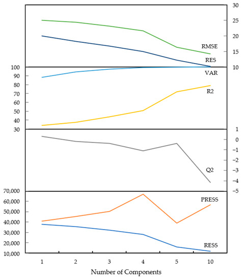 Stacked panel line chart for a variety of quality of prediction statistics tabulated for each of the 1, 2, 3, 4, 5 and 10 component scenarios. Abbreviation definitions: RMSE = root mean squared error; RES = mean absolute residual (all samples); VAR = percentage of model variance explained; R2 = coefficient of determination (×100); criterion (as in Equation (6)); PRESS statistic (as in Equation (5)); RESS statistic (as in Equation (4)).