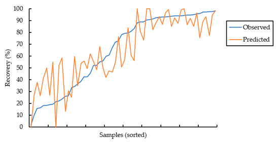 Plot of predicted vs. observed recoveries from the 5-component regression model. Samples are sorted according to ascending observed values to better reflect residual distances; predictions clearly improve in the middle to upper recovery ranges.