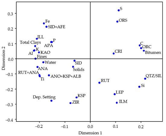 The relationships between the independent variables can be observed visually by plotting the stored -loadings (matrix ) for the first two components (Figure 8). Bitumen content is clearly most strongly linked to elemental carbon and organic carbon (as expected); it also appears in association to silicon (quartz–silica–cristobalite), sulphur (organic sulphur), titanium minerals (rutile and ilmenite) and lepidolite (Li-rich mica). The first dimension also opposes the bitumen group from the clay minerals, water content and carbonates (siderite). Notably, anatase (metastable form of TiO2) plots opposite the other Ti-bearing phases. In the second dimension, the organic-related groups (bitumen, carbon and sulphur) clearly oppose the related silicate and oxide minerals; there is also a broad separation between silicates and carbonate + iron-bearing phases.