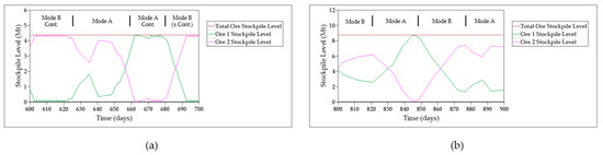 Equations (7) and (8), which ignore the risk of stockout, indicate that Mode A should be applied 1.5 times as often as Mode B, with an average throughput of 28,800 t/h. The framework aims to simultaneously maximize throughput and minimize target stockpile levels, thereby increasing production efficiency and reducing overall costs; larger stockpiles necessitate larger storage areas and equipment, as well as increased handling costs.