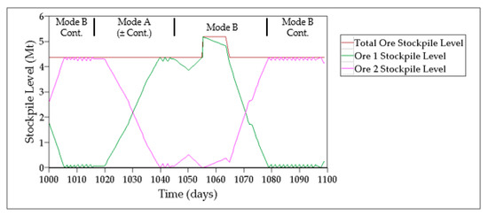 This type of framework can be formulated using commercial DES software to simulate extended operating periods and assess the system-wide response to varied stockpile management strategies. Mode A typically represents a consumption phase, whereas Mode B constitutes a phase of replenishment. While the consumption mode is generally more productive, it is not sustainable to activate indefinitely without an alternate mode of replenishment due to stockout risk [15]. The timing for switching between modes is governed by operational policy, which defines threshold crossing events (i.e., critical ore level).