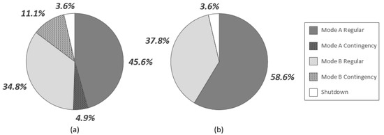 where tA and tB denote the time elapsed under Modes A and B, respectively. Average throughput between the two modes, or similarly between each mode and its corresponding contingency configuration, can then be computed as follows [15,17]: