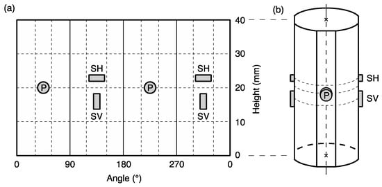 Triaxial deformation experiments were performed using the intra-vessel deformation and fluid flow apparatus at Hiroshima University (Hiroshima, Japan); please see [] for more detail about the apparatus. All experiments were conducted under dry conditions at a constant displacement rate of 0.002–0.003 mm/min (corresponding to an equivalent strain rate of ~10−6 s−1), at room temperature, and with a confining pressure of 20 MPa. The confining pressure was set to a constant value using a servo-controlled system to compensate for the piston movement during deformation. Axial displacement was measured by the external displacement transducer, while differential stress was determined from the difference between the axial and confining pressure, with an accuracy of 0.5 MPa. A machine stiffness correction was applied to the axial displacement data to account for mechanical distortion during deformation. The mechanical parameters were recorded by a data logger at a sampling rate of 1 Hz. As our experimental apparatus was not equipped with a high-resolution feedback system, the data logging was stopped immediately after the macroscopic failure; therefore, we focused on the evolution of elastic wave velocities approaching the maximum differential stress, but not during the post-failure processes. The sample was jacketed in a polyolefin tube and silicone to separate it from the oil confining medium. Elastic wave velocities were measured with lead zirconate titanate piezoelectric transducers of resonant frequency 2 MHz, using a pulse transmission method. Both P-wave and S-wave velocity data were acquired along the direction normal to the loading axis (Figure 2). S-waves were polarized in the planes perpendicular (SH-wave) and parallel (SV-wave) to the loading axis (σ1). An input pulse with an amplitude of 5 V and frequency of 2 MHz was sent to each transducer by a function generator, and the output signal was received by the remaining transducers and digitalized by an oscilloscope. The velocity was then determined by dividing the path length by the travel time. The error in ultrasonic velocities was estimated as <1%, which reflects the picking accuracy of wave arrival times and possible changes in propagation path length owing to sample dilation during deformation. The S-wave anisotropy AS is calculated from SH-wave velocity VSH and SV-wave velocity VSV as: