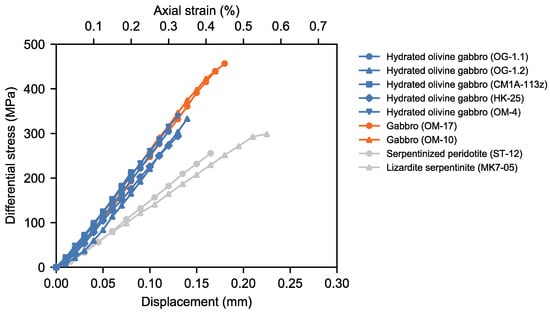 Figure 3 shows the mechanical data obtained from the deformation experiments, with differential stress plotted as a function of axial displacement (strain). The results of the experiments are summarized in Table 1. Maximum differential stresses of ~450 MPa are recorded for the gabbro samples, which are comparable to those of granite deformed under similar conditions []. Hydrated olivine gabbro samples with hydrous mineral contents of 6–27% yielded maximum differential stresses ranging from 225 to 348 MPa. These values are 20–50% less than that those of gabbros but are similar to those of serpentinized peridotite and lizardite serpentinite (257–300 MPa).