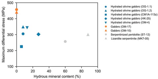 Relationship between the maximum differential stress and the hydrous mineral content of each sample.