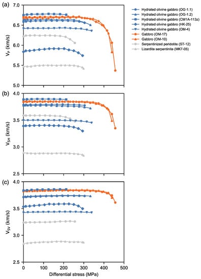 - Akamatsu, Y.; Katayama, I.; Tonegawa, T. Changes in elastic wave velocity during brittle deformation of gabbro and peridotite: Implications for oceanic Moho reflectivity. Earth Planet. Sci. Lett. 2021, 568, 117036. [Google Scholar] [CrossRef]