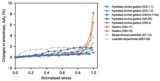 - David, E.C.; Brantut, N.; Hansen, L.N.; Mitchell, T.M. Absence of stress-induced anisotropy during brittle deformation in antigorite serpentinite. J. Geophys. Res. Solid Earth 2018, 123, 616–644. [Google Scholar] [CrossRef]