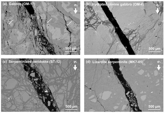 Post-deformation, samples were recovered, impregnated with epoxy, and cut perpendicular to the fault zone to prepare polished thin sections for observation with a 15 kV scanning electron microscope (SEM). Figure 7 shows SEM images of representative microscale segments of the fault profile developed in each rock type. In these micrographs, the direction of axial compression is vertical. At sample scale, the faults develop at the angle of 20–30° from the loading axis in all samples. The gabbro samples show swarms of cracks oriented subparallel to the compression axis on both sides of the faults (Figure 7a). This stress-induced axial cracking is consistent with the anisotropic changes in elastic wave velocities observed in these samples during deformation (Figure 5) and with results from previously tested dilatant rocks. In hydrated olivine gabbro samples, crack damage is limited to the immediate vicinity of the fault zone. Areas away from the fault zone remain essentially undeformed and are indistinguishable from the pre-deformation material (Figure 7b). Macroscopic failure in the olivine gabbros appears to result from the sudden occurrence of one or more major fractures, as opposed to the propagation and coalescence of axial cracks that are commonly observed in most crystalline rocks []. SEM images of the serpentinized peridotite and serpentinite samples (Figure 7c,d) show similar features to those of the hydrated olivine gabbros. These observations are consistent with the absence of marked velocity changes recorded during deformation of the hydrated olivine gabbros and ultramafic rocks (Figure 5 and Figure 6).