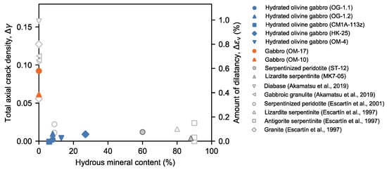 Relationship between the total axial crack density, amount of dilatancy, and hydrous mineral content for each experimental sample. The total axial crack density was calculated using the effective medium theory [,]. The amount of dilatancy was calculated as Δεv = Δϕc = 2πΔγα, using an aspect ratio of 0.01. Moreover, plotted are experimental data for a range of dilatant and non-dilatant rocks reported by previous studies [,,]. Experimental conditions were 20 MPa and room temperature for data from Akamatsu et al. [] and 50–200 MPa and room temperature for data from Escartín et al. [,].